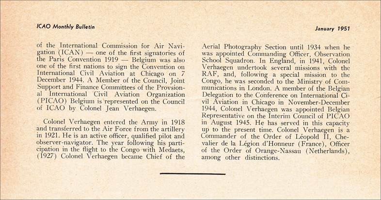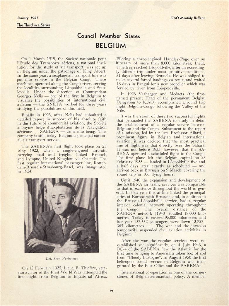 ICAO Monthly Bulletin January 1951 Front page and other pages related to Belgium as Council Member State. |
