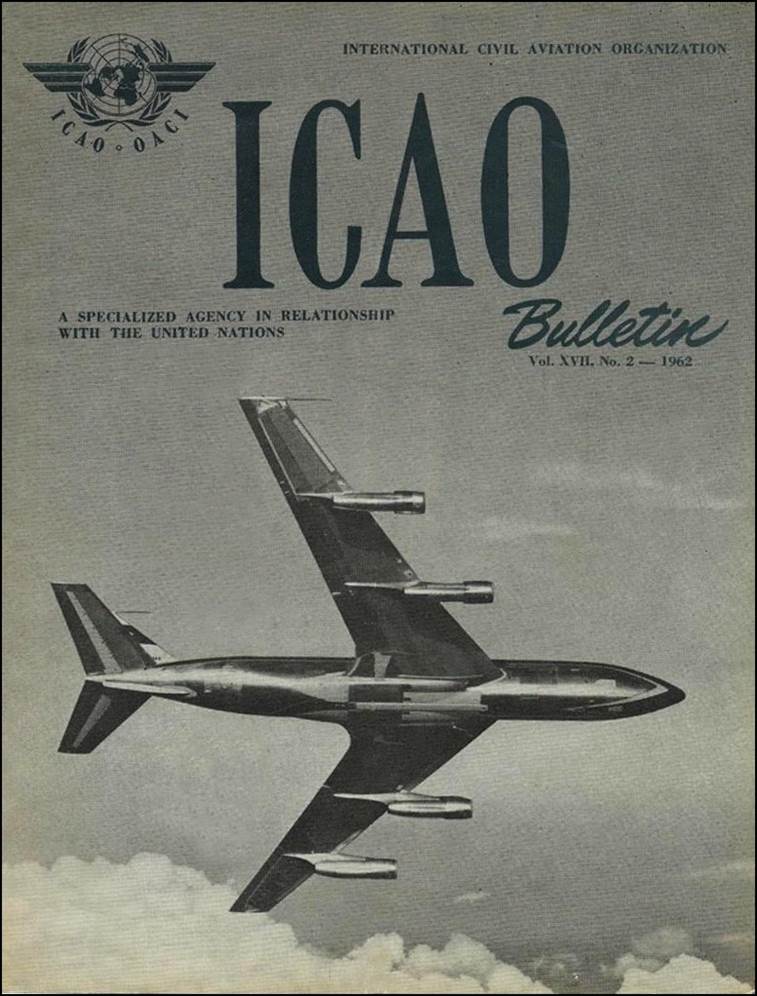 ICAO Bulletin – 1962 Vol. XVII, No. 2. Front page. This picture shows a Boeing 720B on a training flight, as it does an unusually steeply 180-degree turn above some healthy cumulus. The 720B was the version of the 720 with JT3D turbofan engines, resulting in lower fuel consumption and higher thrust. The 720B first took to the skies on 6 October 1960; it received certification and entered service with American Airlines in March 1961. |