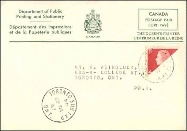 In the ICAO Bulletin issues of April, August and September 1967, advertisements were placed requesting readers to renew their subscription at the price of US$2.00 per year; each issue cost US$0.25 at that time. Meanwhile, contacts were made with the Canadian Offices in Ottawa searching ways to extend the subscriptions of the Bulletin by getting in touch with their addresses. To this end, cards were printed by the Canadian Department of Public Printing and Stationery with texts in French/English, then cut in half (to separate the French and English parts) and sent out at the negotiated rate for a printed postcard, i.e., 2 cents, while the rate of the domestic mail was 5 cents. From the existing stock, Queen Elizabeth II 4-cent carmine stamps (from the QEII Cameo portrait issue, 1962-1963) were cut in half diagonally (bisected stamp) and used on the postcards for half of their stated face value.