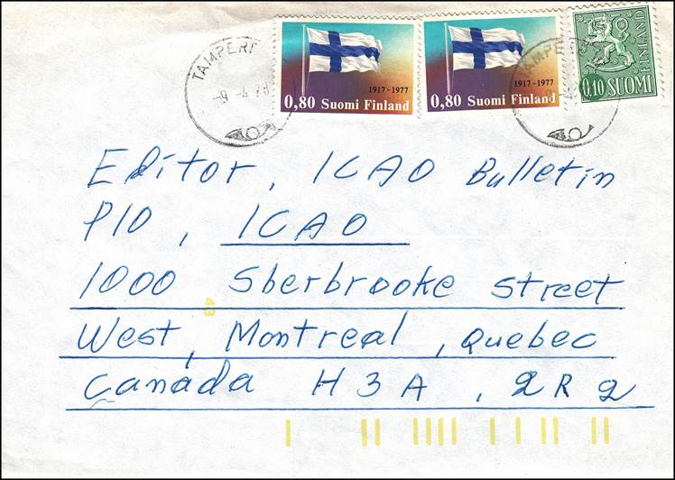Commercial cover sent from Tampere, Finland to the Editor of the ICAO Bulletin Postmarked on 9 April 1978. |