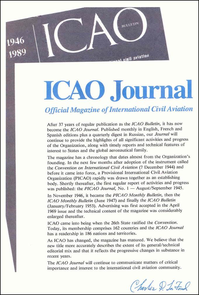 In January 1990, the ICAO Bulletin became the ICAO Journal, describing more accurately the extent of its general and technical editorial mix and reflecting the progressive changes in substance over the years. With the display of colour photos, the publication evolved to a modern look.