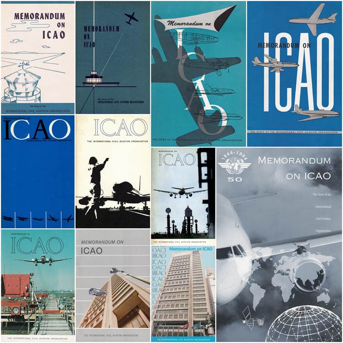 This picture shows a montage of the various editions of the MEMORANDUMS ON ICAO, from the 1st edition of the 15th (and last) edition issued in January 1994 on the occasion of the 50th anniversary of ICAO. |