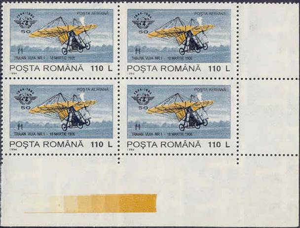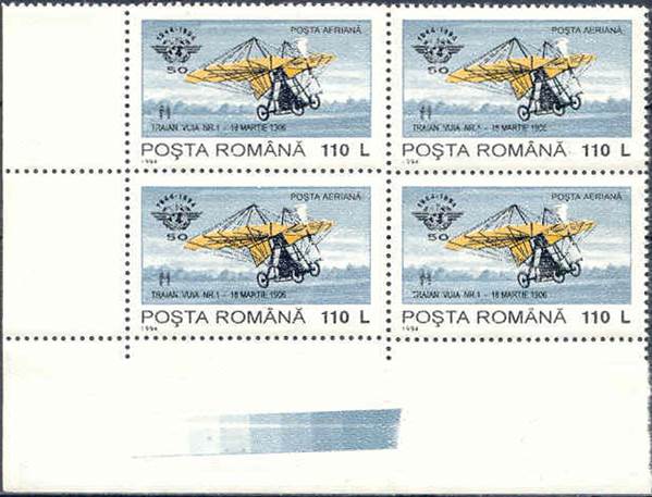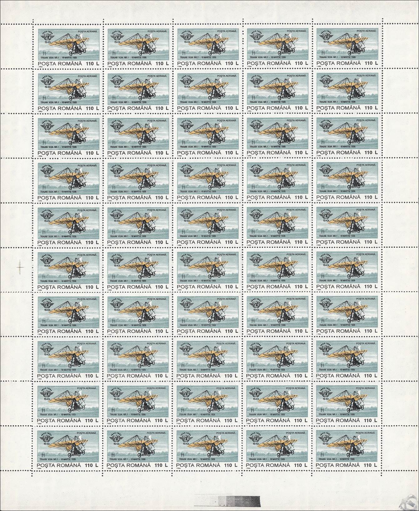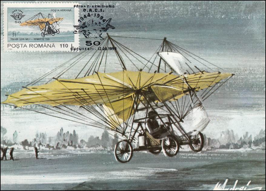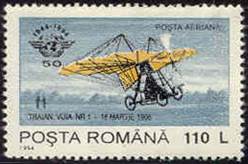 Early aircraft (Vuia Nr 1), 18 March 1906. This stamp pays a tribute to Romanian Traian Vuia's achievement, when on 18 March 1906, in Montesson, France, he flew in the monoplane Vuia Nr 1 over a distance of 12 meters at the height of 0.6 meter. Printed on paper with watermarks. |