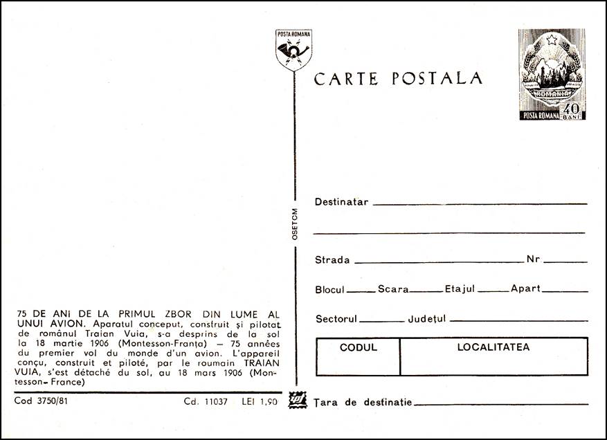 Maximum card (Front and Back with text in Romanian and French); design by Mihai Andrei.