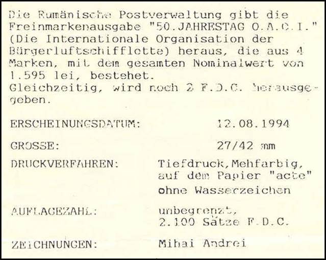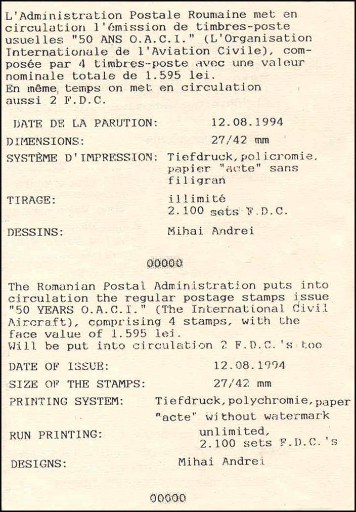 Background: Airmail stamps. Philatelic notice: Errors in the spelling of ICAO’s name in all the languages used in the notice: 1. In Hungarian: the name should be: Organizatia a Aviatiei Civile Internationalã, (and not: Organizatia Internationalã a Aviatiei Civile). 2. In French: the name should be: Organisation de l’aviation civile internationale, and not Organisation Internationale de l’Aviation Civile). 3. In English: the name should be The International Civil Aviation Organization (and not: The International Civil Aircraft). 4. In German: the name should be Die Internationalen Zivilluftfahrt Organisation (and not: Die Internationale Organisation der Bürgerluftschifflotte).