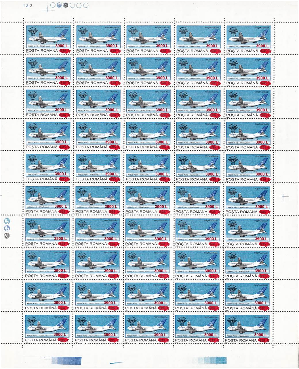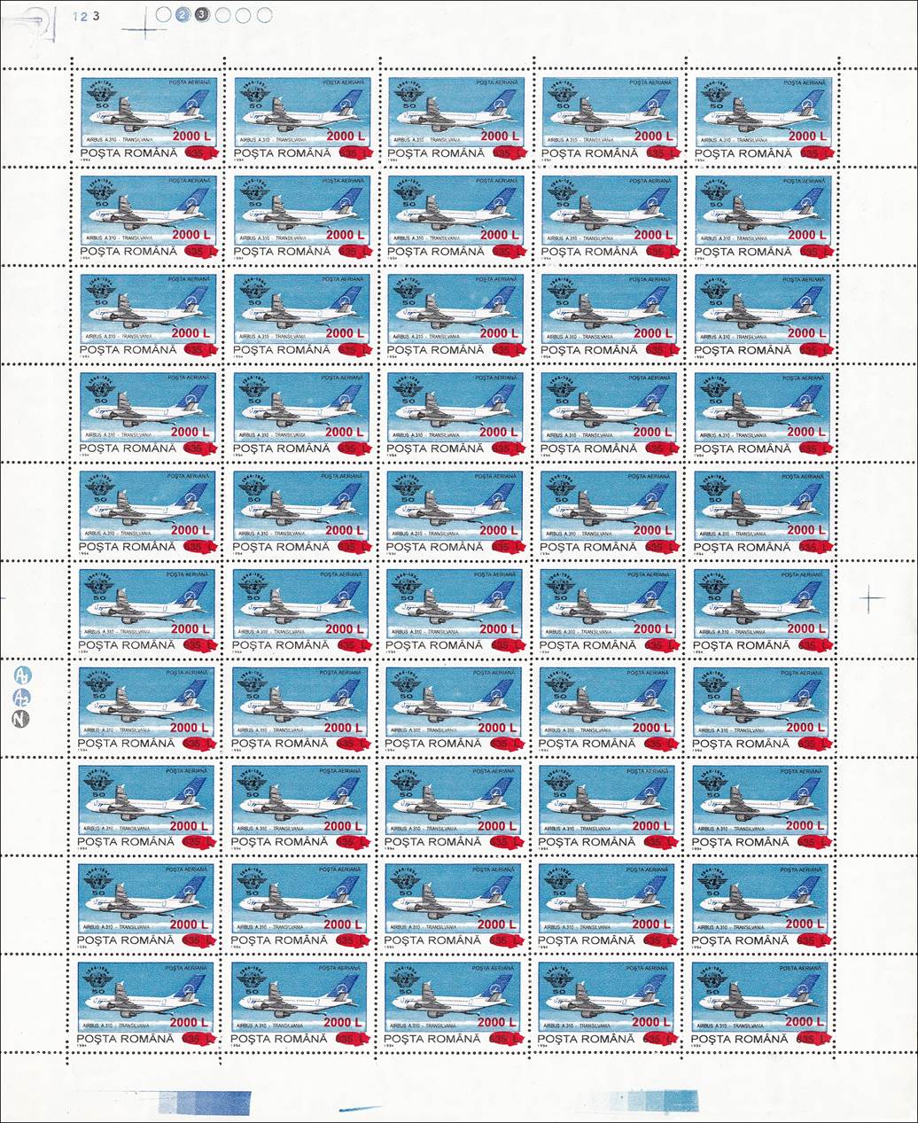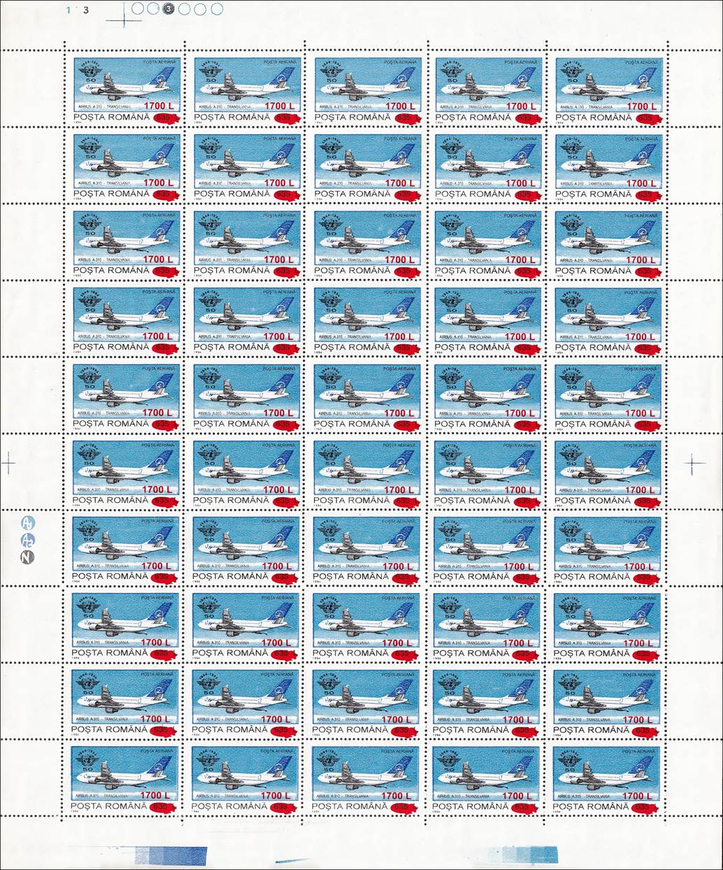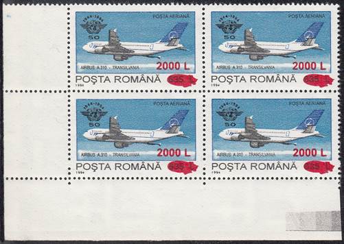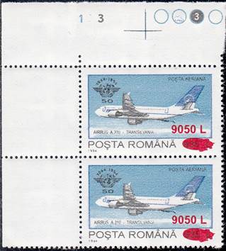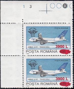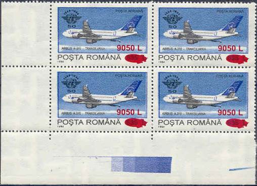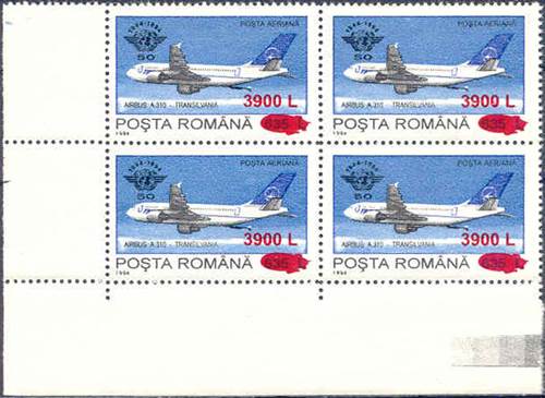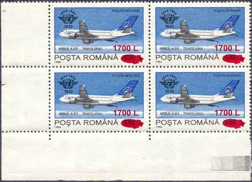The "Fr" watermark normally appears only on Fiscal/Revenue stamps. In the years 1994-1995, when lacking printing paper, the stamp factory also used such kind of paper for regular issues, especially in reprinting some sold-out definitives values, such this set related to ICAO 50th anniversary (1994) surcharged in 2000. The letter "F" comes from "Fiscală" (Revenue) and "r" from "Romania agenție fiscală".