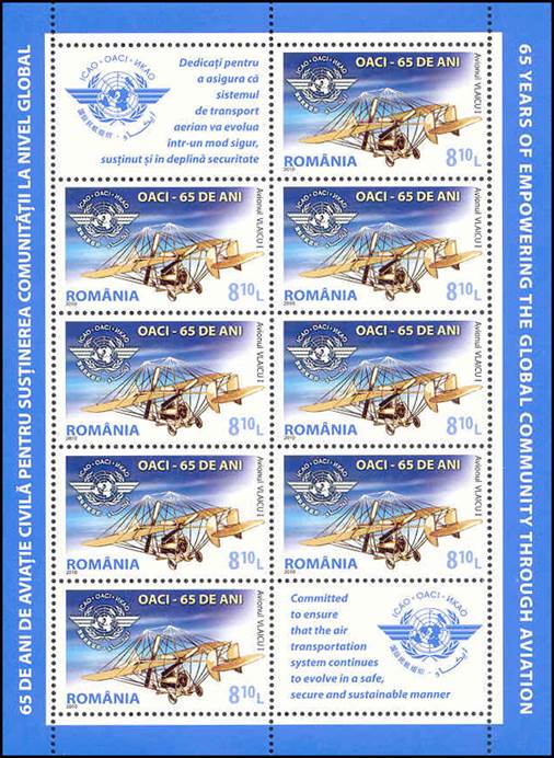 Background: This issue also commemorated the International Civil Aviation Day, which was celebrated for the first time in 1994 on the occasion of ICAO’s 50th anniversary. The 2009 International Civil Aviation Day with its theme: “65 Years of empowering the global community through aviation” highlighted ICAO’s contribution to the global community. ICAO actually celebrated its 65th anniversary on 7 December 2009. The Vlaicu No. I (nicknamed La Folle Mouche or The Crazy Fly) was an aircraft built in 1909 by Aurel Vlaicu (1882-1913), a Romanian engineer, inventor, airplane constructor and early pilot. This Vlaicu I parasol-winged monoplane was the first Romanian aeroplane to fly and was test flown on 17 June 1910. The latter date was subsequently declared the National Aviation Day in Romania. |