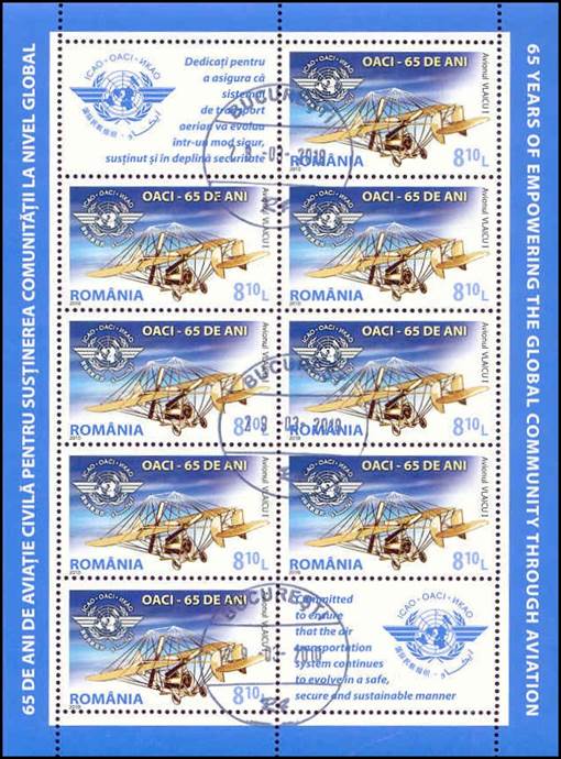 stamps (117 Commemorates the 2009 International Civil Aviation Day with its theme: “65 Years of empowering the global community through aviation”. This sheet of Romania offers, through the window of an airplane, a view on a world above all clouds, where aviation would develop in an environmentally sustainable manner within a robust regulatory framework secured through global cooperation and consensus among ICAO’s Member States.