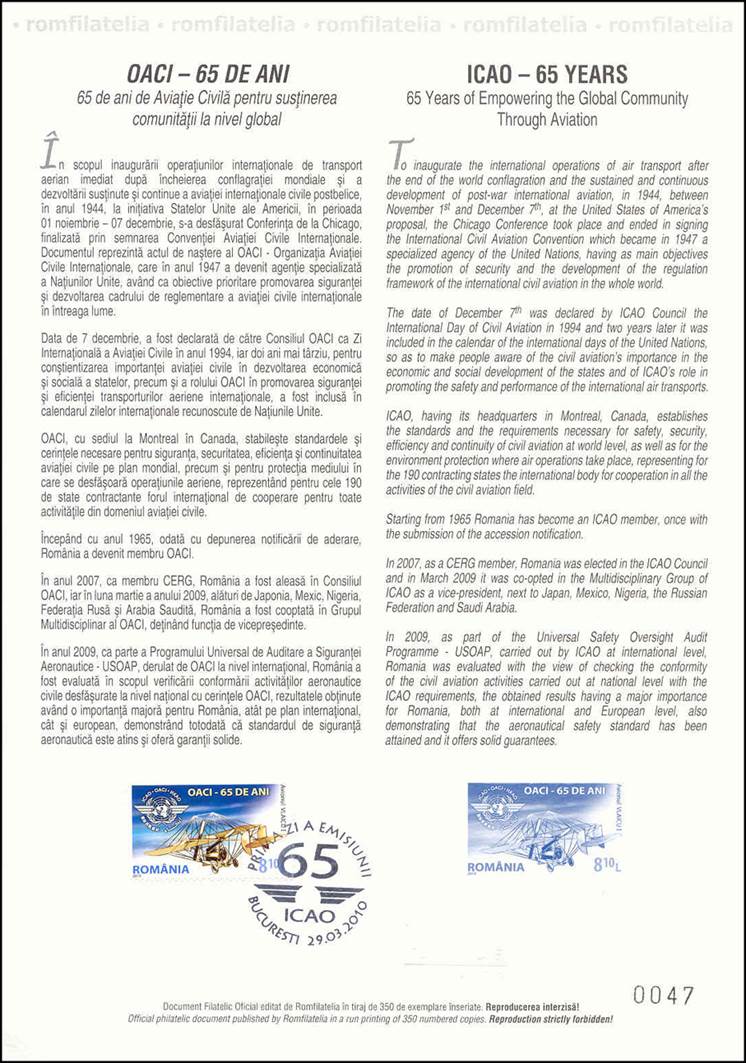 Official philatelic document 6424, printed in 350 copies. With a special seal not visible here on the picture. The second sentence in Romanian reads as follows: Documentul reprezintă actual de naştere al OACI - Organizaţia Aviaţiei Civile Internaţionale, care în anul 1947 a devenit agenţie specializată a Naţiunilor Unite, which can be translated into: The document actually gave birth to ICAO - International Civil Aviation Organization, which became in 1947 a specialized agency of the United Nations. The English translation on the printed document reads as follows and is incorrect: … the Chicago Conference took place and ended in signing the International Civil Aviation Convention which became in 1947 a specialized agency of the United Nations. In fact, the Chicago Convention made provision in its Article 43 for the establishment of the International Civil Aviation Organization (Article 43 of the 1944 version of the Convention reads as follows: An organization to be named the International Civil Aviation Organization is formed by the Convention.). The Convention did NOT become the Organization!