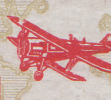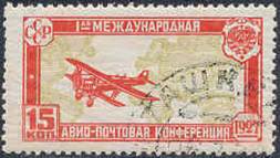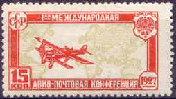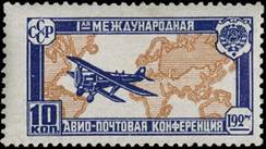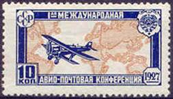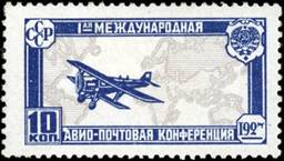 Biplane Tupolev ANT-3 over a Mercator projection map of the world; translated text: 1st INTERNATIONAL / AERO-POSTAL CONFERENCE. Five-pointed white star on the tail of the aircraft. |