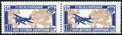 Variety of the 10-kopeck stamp: left stamp with broken "7" (i.e. white spot in "1927"; position 26 in the full sheet, plate flaw) and right stamp with a white spot on "П" in "ПОЧТОВАЯ" (position 27 in the full sheet, plate flaw). Pair and very rare as such.