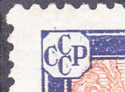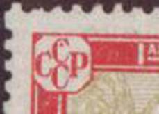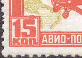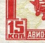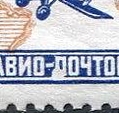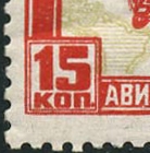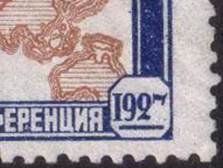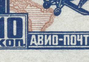 Variety of the 10-kopeck stamp with two plate flaws: white spot on upper-left side of A of "ABИO" and white spot on the digit "7" in the year 1927 (see enlarged pictures). |