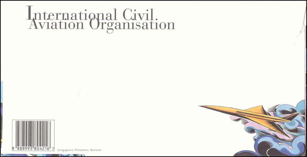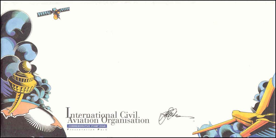 Background: The four stamps reflect the progressive, high‑tech and futuristic nature of the aviation industry. For all the stamps of this issue, the Organization’s name is printed with s instead of z. The correct name is: International Civil Aviation Organization.