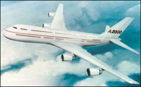 sector which was the monopoly of Boeing. Preliminary studies Several projects of airplanes with two superimposed bridges emerged early in the 90s. 1. Aerospace ASX 600 and ASX 700 or Deutsche A2000 Airbus: It was an airplane with the cockpit being on the higher bridge (see picture on the opposite left). This solution was based on a cell of Airbus A340 surmounted by that of an Airbus A320. 2. Boeing 787 or 797: It was an airplane having the cockpit located in front of the lower bridge. 3. McDonnell Douglas MD 12: Of all the projects, the MD 12 was the least ambitious. It was a plane with a cockpit located half-way between the two bridges.