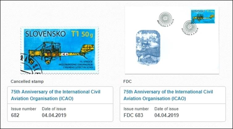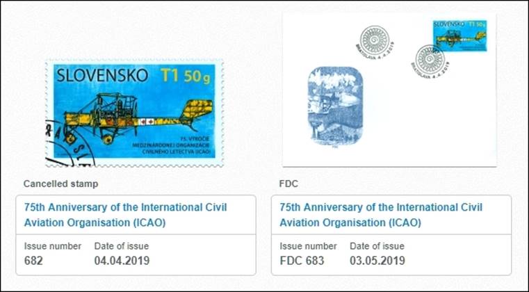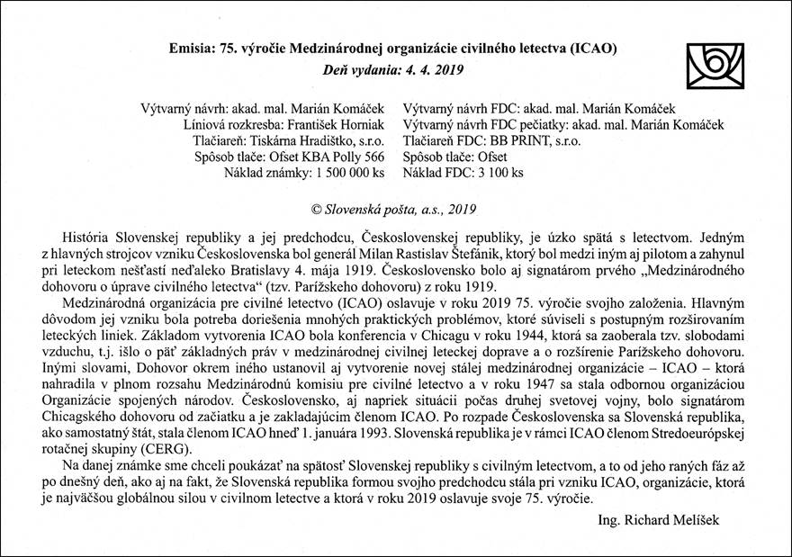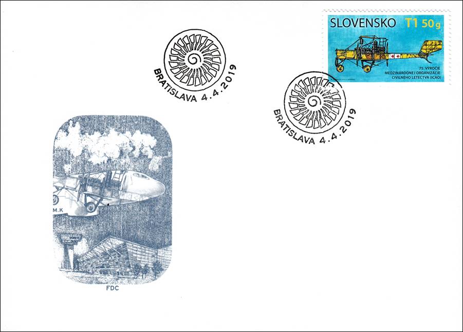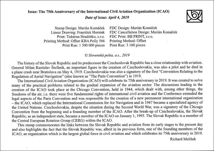 Background: The stamp commemorates the links between the Slovak Republic and aviation from its early stages to the present day and also highlights the fact that the Slovak Republic was, albeit in its previous form, one of the founding members of the ICAO, an organization which is the largest global force in civil aviation and which celebrated its 75th anniversary in 2019. Designer of the stamp and the cachet on the first day cover, Marián Komáček, is a Czech artist, born in 1959. The date of this stamp issue corresponds exactly to the 72nd anniversary of the entry into force of the Chicago Convention, i.e., on 4 April 1947 (and not the 100th anniversary of Štefánik’s death which was on 4 May 2019). Czechoslovakia was a signatory of the Convention Relating to the Regulation of Aerial Navigation (also known as the Paris Convention which established the International Commission for Air Navigation, ICAN or Commission internationale de Navigation Aérienne, CINA) in 1919. Czechoslovakia, despite the situation during the Second World War, was a signatory of the Chicago Convention from the beginning and a founding member of ICAO. After the break-up of Czechoslovakia on 1 January 1993, the Slovakia (officially the Slovak Republic), as an independent state, became a member of ICAO on 15 March 1993.