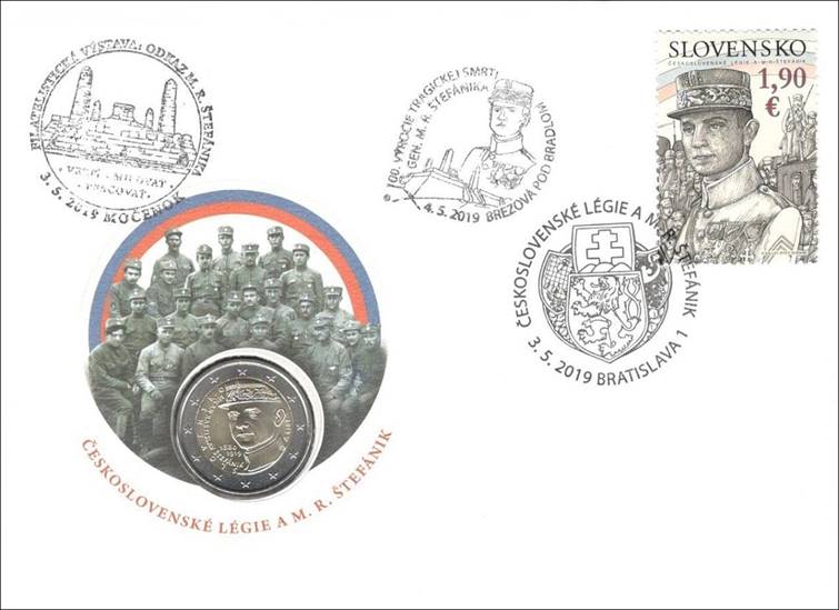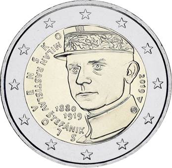 Coin commemorating General Milan Rastislav Štefánik. Along with the above-mentioned stamp commemorating General Milan Rastislav Štefánik, Slovakia issued a 2-Euro bimetal coin on 3 May 2019. Characteristics: Diameter: 25.75 mm; Weight: 8.5 gr; Copper-nickel/nickel brass. It was also inserted in a numismatic cover (see above) and a coin card (4,000pcs).