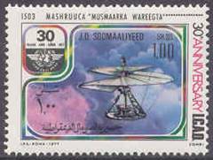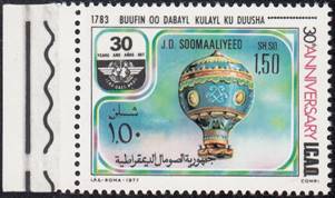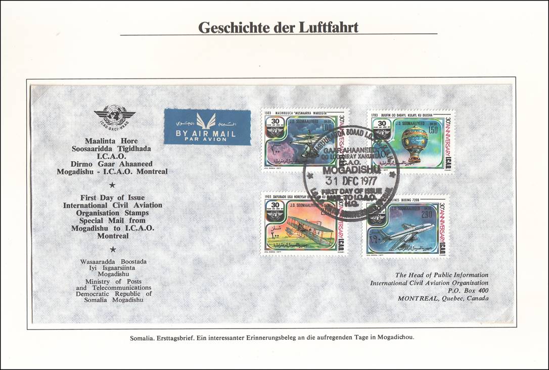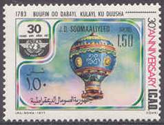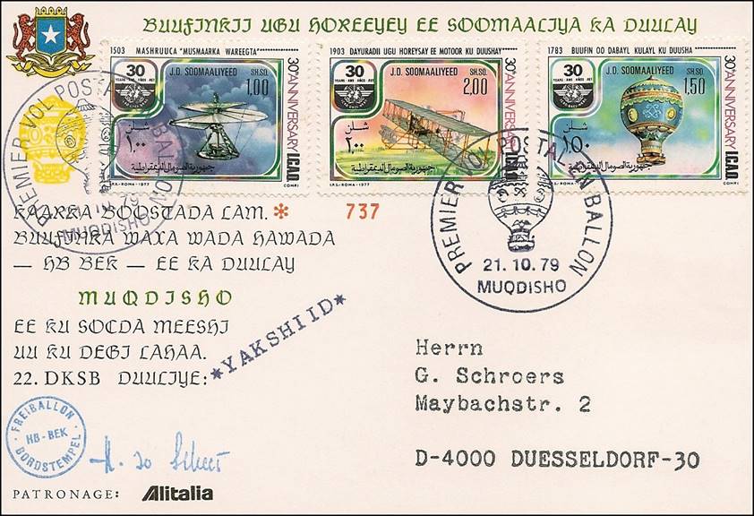 Three stamps of this issue were utilized on a special souvenir card issued on the occasion of the charitable flight by hot air balloon to sponsor the SOS Children's Villages. The cancel dated 21 June 1979 (with text: PREMIER VOL POSTAL EN BALLON) shows Montgolfier’s hot-air balloon; the Montgolfier Brothers made their first manned free flight by balloon on 21 November 1783. Somalia's coat of arms (shown at upper-left corner of the card) features two leopards supporting a shield, which bears the white star of the national flag; below the shield are two crossed lances and palm fronds wrapped in a ribbon. The text in Somali language is translated as follows: 1. At the top: THE FIRST HOT AIR BALLOON (FLIGHT) PERFORMED IN SOMALIA 2. Just below the stamps at the left-side (on several lines): a. POSTCARD NUM. * 737 b. THE BALLOON IS FLOWN BY THE AIR (WIND) c. HB BEK – THAT TOOK LAUNCHED FLIGHT FROM MOGADISHU AND HEADING TO ITS DESTINATION * YAKSHIID * d. 22. DKSB PILOT HB-BEK SCHIESSER is the name of the hot air balloon flown by Pilot H. Jo Scheer between Mogadishu and Yakshiid (one of the districts of Mogadishu) on 21 June 1979 to sponsor the Children's Villages. Flown card, as shown by the blue hand-cancel: Freiballon - HB-BEK – Bordstempel (Bordstempel means board stamp). The Italian airline Alitalia was the supporter of this event. DKSB is the abbreviation for Deutsche Kinderdorfsonderballonpost. DKSB-22 is the catalogue number for the German Children Village Special Balloon Mail. SOS Children's Villages (Kinderdorf) is an independent, non-governmental international development organization which has been working to meet the needs and protect the interests and rights of children since 1949. Blue facsimile signature of Pilot H. Jo Scheer.
