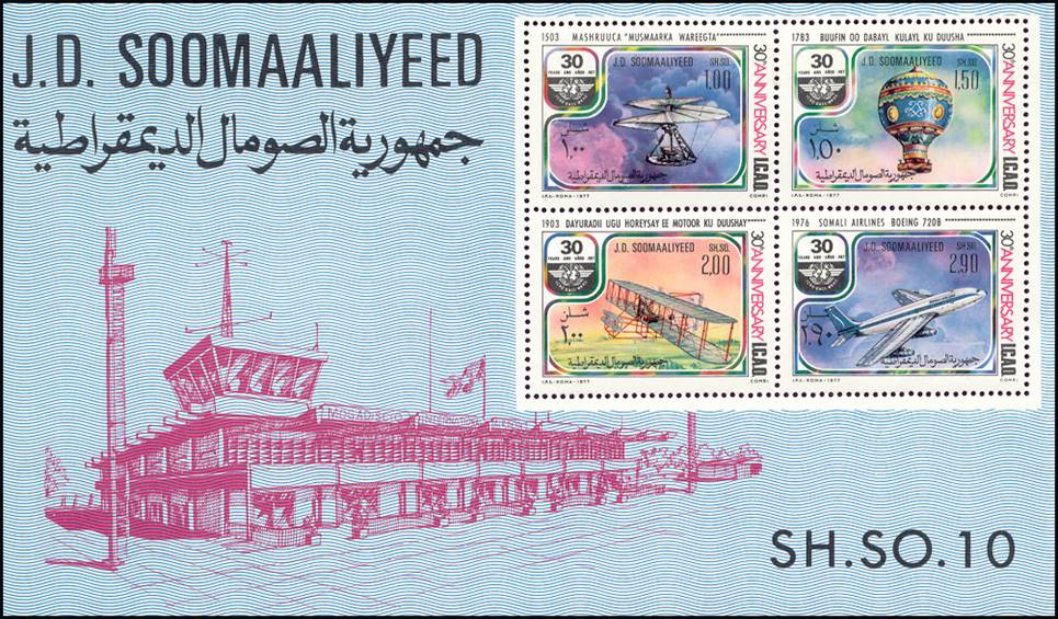 Miniature sheet showing the four stamps of the issue and a picture of the International Airport of Mogadishu, Somalia (named Aden Adde International Airport after Aden Abdullah Osman Daar, first President of Somalia from 1960 to 1967).