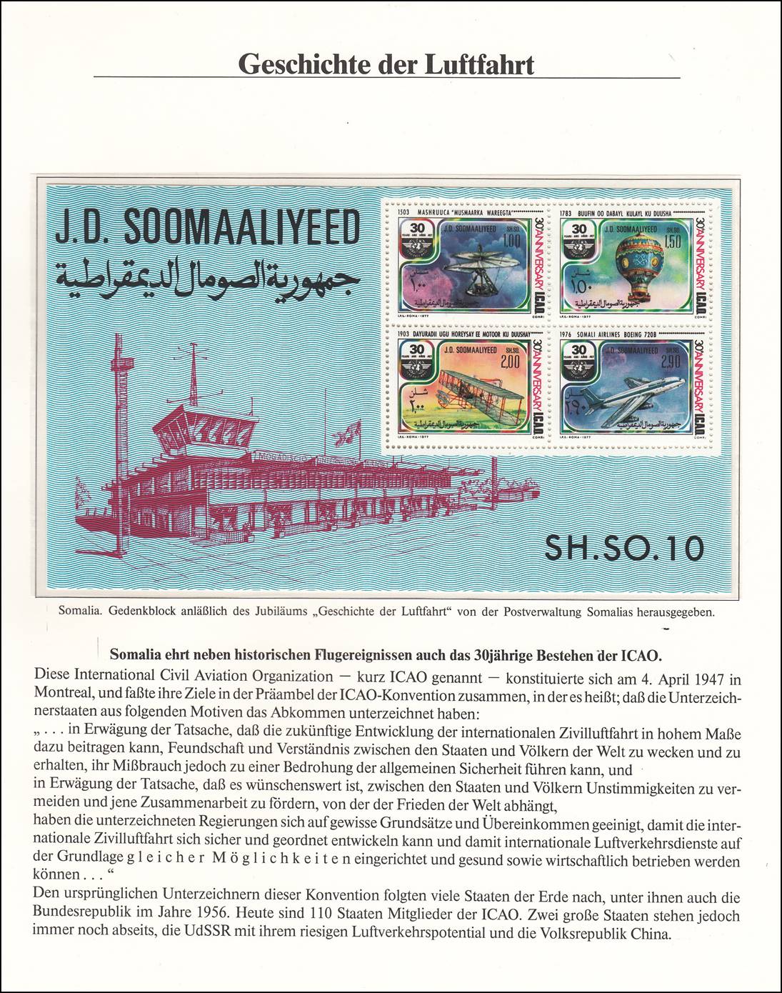 Miniature sheet mounted on Rowland Hill Gesellschaft hingeless album sheet with explanatory notes in German - Geschichte der Luftfahrt.