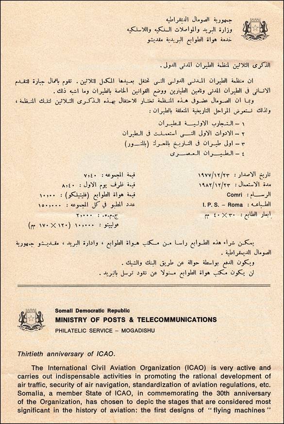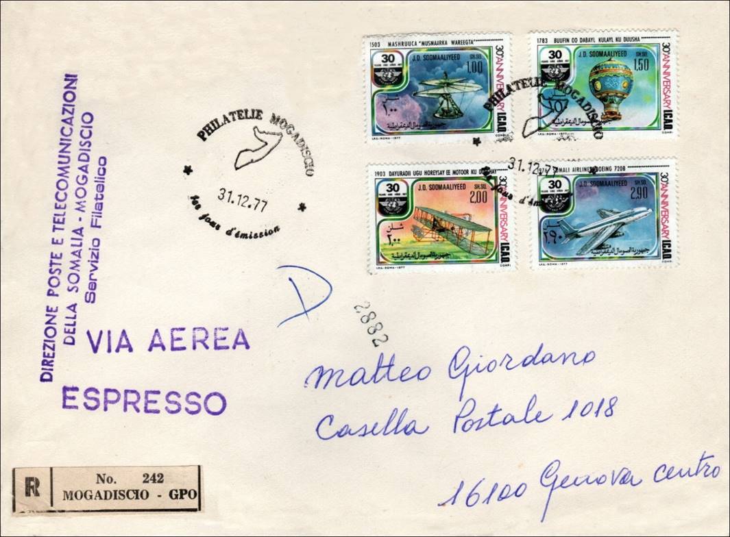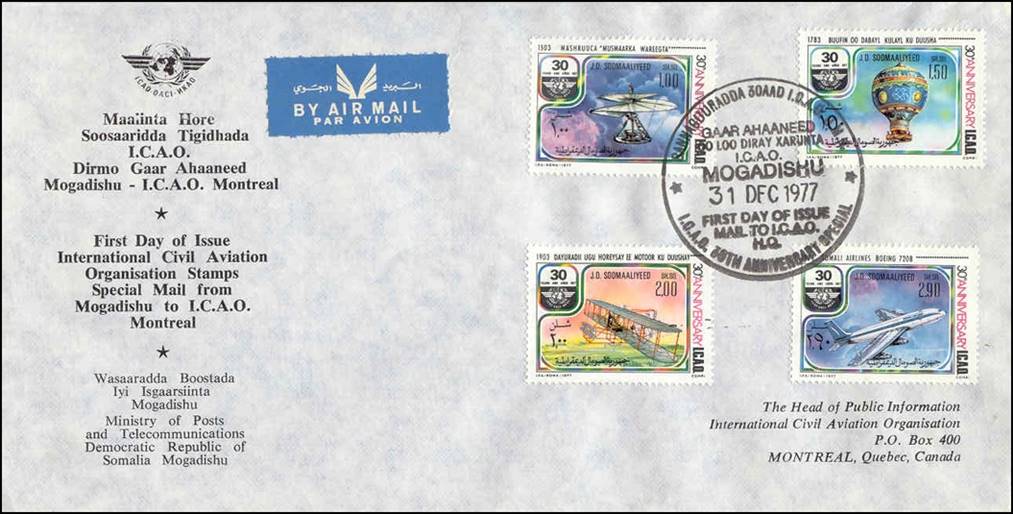First Day of Issue – Special cover sent from the Ministry of Posts and Telecommunications, Mogadishu to the Head of Public Information (PIO) at ICAO.