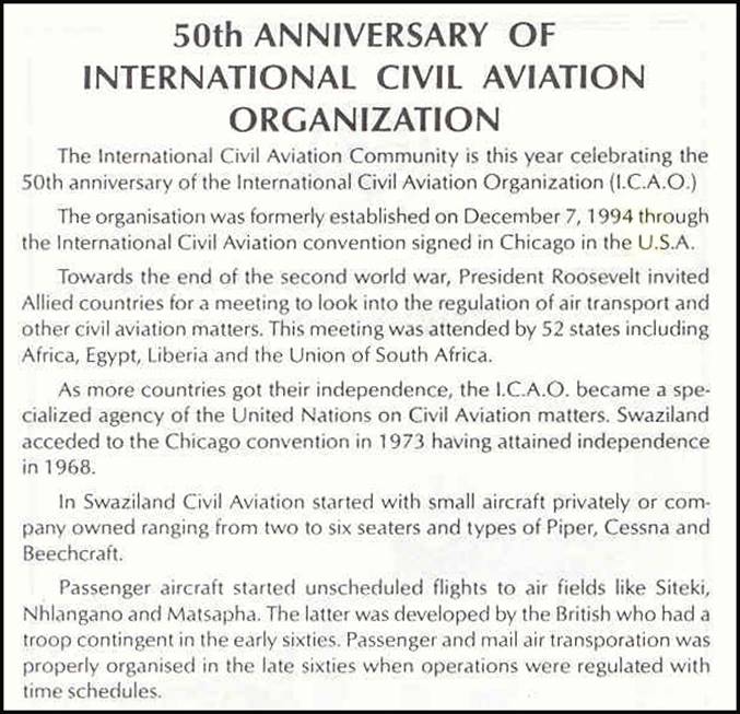 Philatelic notice printed by the Swaziland Stamp Bureau; it shows a major error, i.e. that the Organization was formerly established on December 7, 1994. The Chicago Convention on International Civil Aviation was signed on 7 December 1944, and not in 1994. It is also interesting to note that the word Organization is properly spelled on the philatelic notice, whereas the First Day Cover (see below) shows this word with “s” instead of “z”.