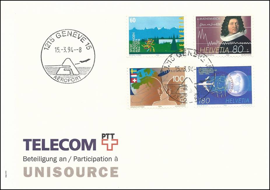 First Day Cover with the 4 stamps of this issue, issued by the Swiss P.T.T. Cancel at Geneva Airport. Cachet related to the participation of TELECOM PTT to UNISOURCE.