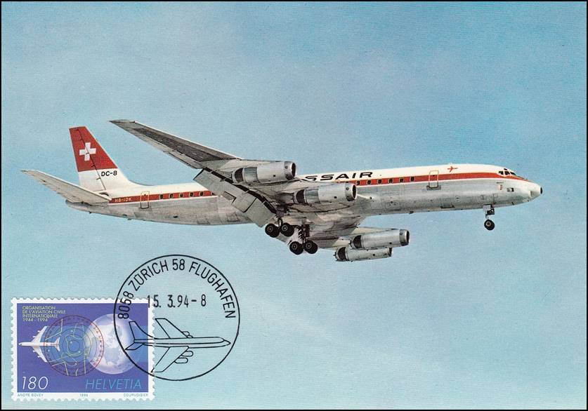 Maximum Card with Douglas DC-8-62CF (4 engines) in landing position. Zurich Airport cancellation. Registered HB-IDK.