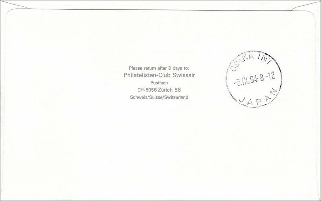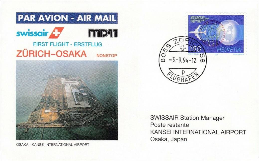 Front and back of First Flight Cover (FFC) from Zurich to Osaka Kansei International airport, Japan; Swissair MD-11 departing on 3 September 1994. Photograph of runway approach to Kansei. Cover prepared by the Philatelic Club of Swissair.