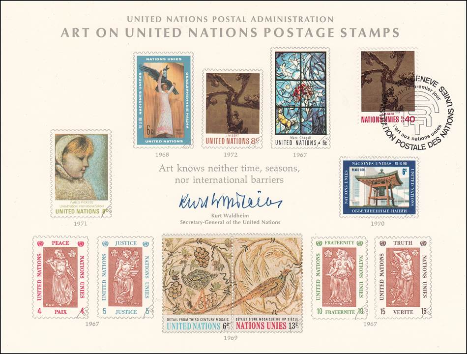 Souvenir Card Art on United Nations Postage Stamps. Issued on 17 November 1972, with statement and facsimile signature by Kurt Waldheim, Secretary General of the United Nations. |
