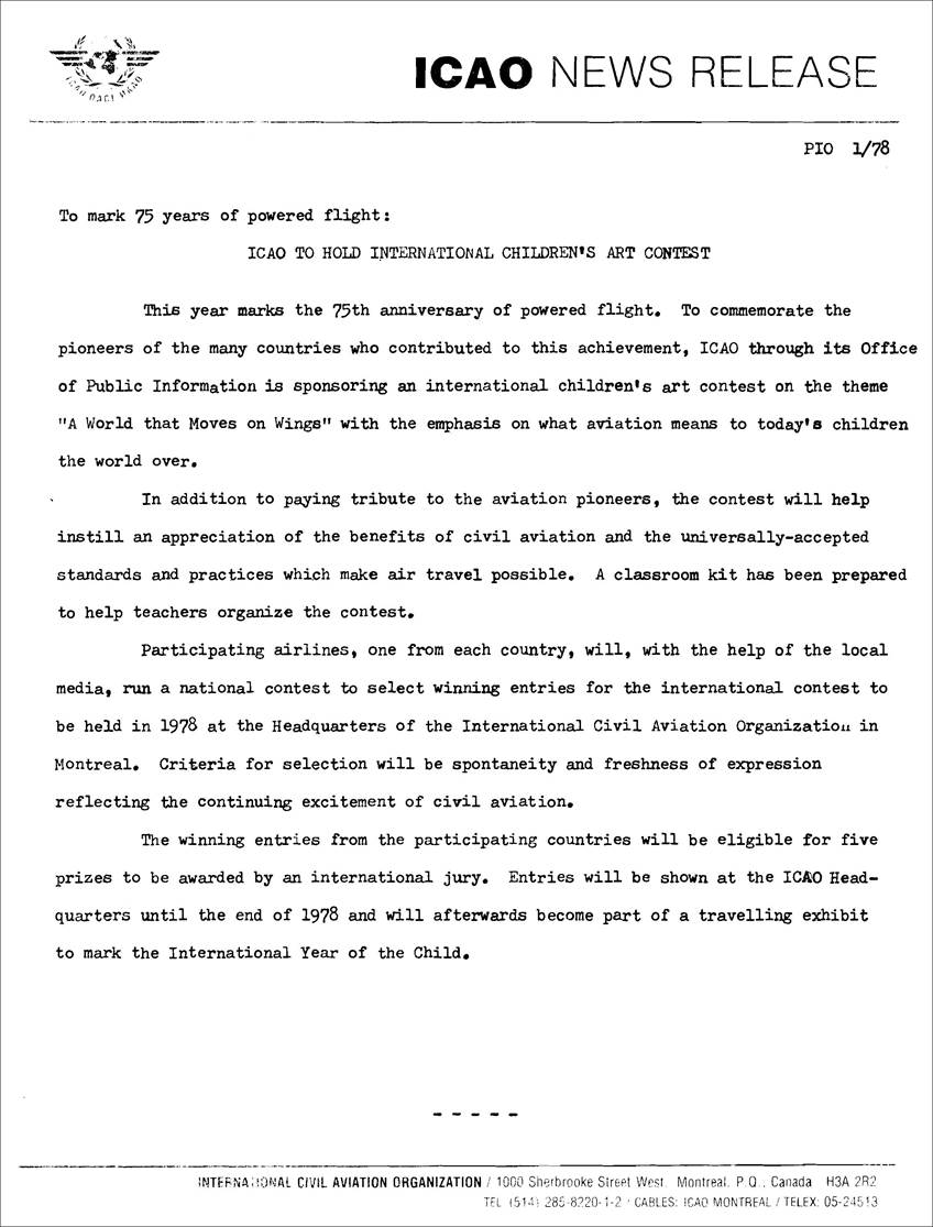 ICAO News Release PIO 1/78 announcing the international children’s art contest on the theme A world that moves on Wings to mark the 75 years of powered flight.