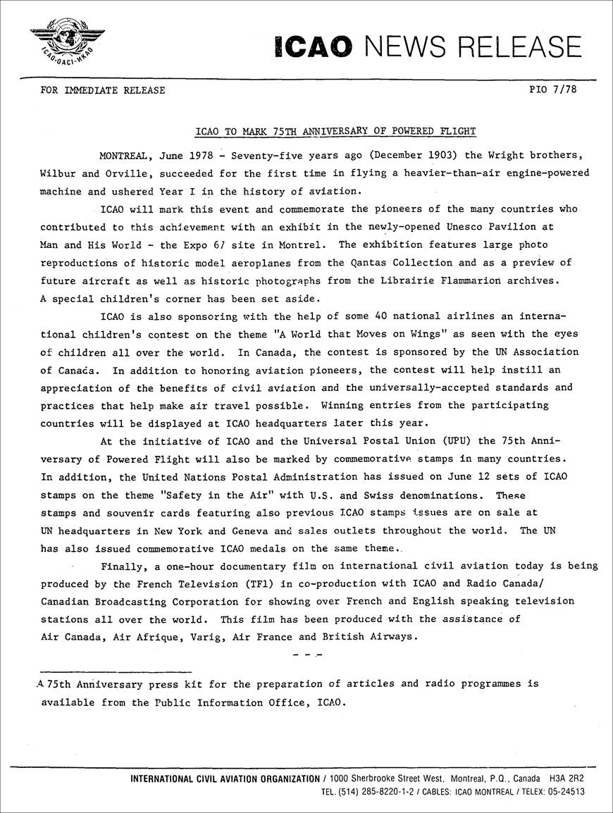 ICAO News Release PIO 7/78 announcing the marking of the 75th anniversary powered flight.