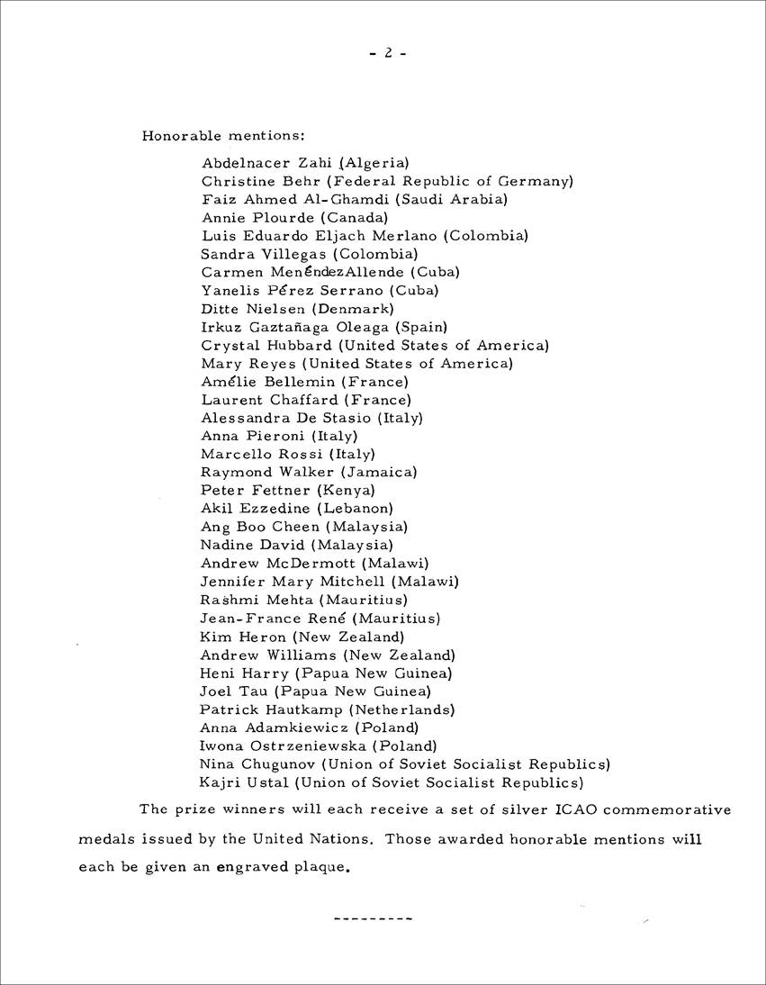 The prize winners each received a set of silver ICAO commemorative medals issued by the United Nations. Those awarded honorable mentions received an engraved plaque. Seven of the winning original entries, shown hereafter, from the participating countries are displayed at ICAO Headquarters.