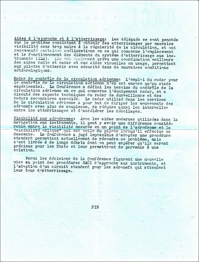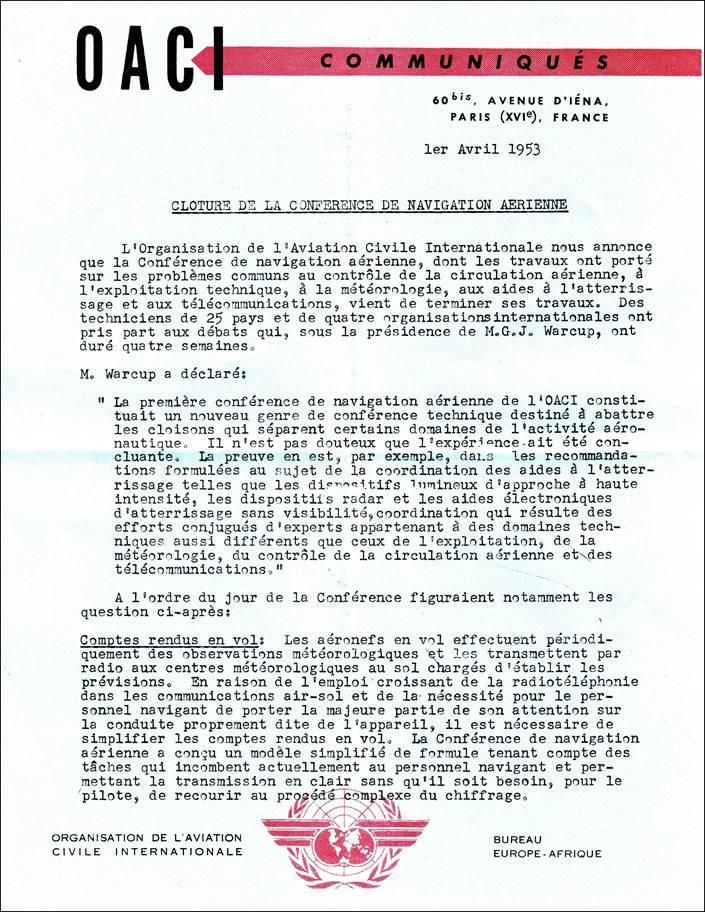 1st Air Navigation Conference held from 24 February to 24 March 1953. Letter (see front and back of the cover) with the results of the Conference, sent by ICAO’s European/African Office to the Delegates having attended the Conference.