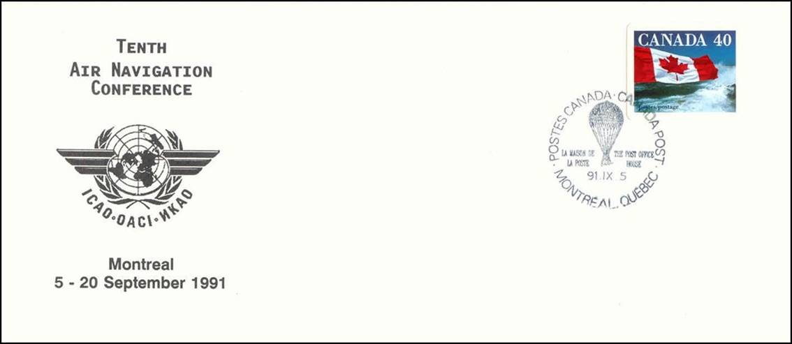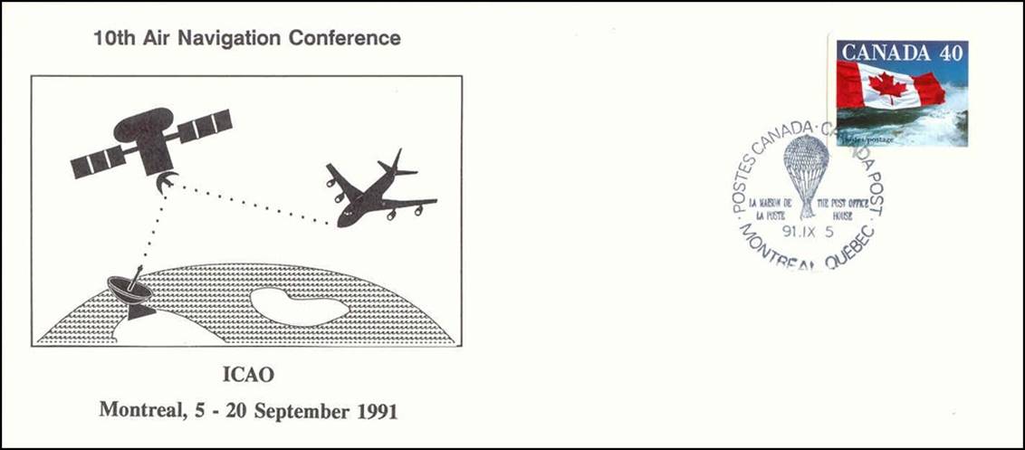 Commemorative covers issued for the 10th Air Navigation Conference held in 1991. Sketch of satellite-based communications between aircraft and ground.