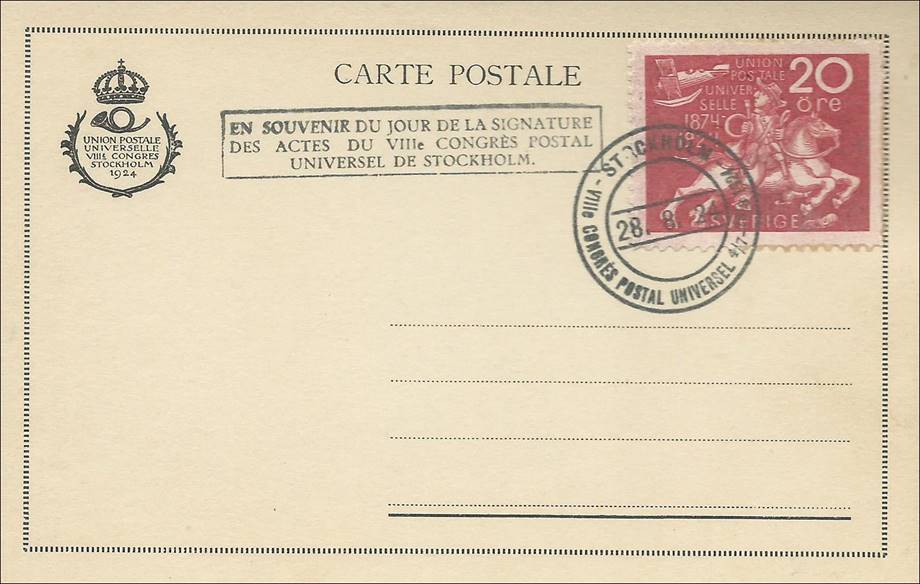 UPU Congress of 1924 held in Stockholm. The second cover bears the special hand-stamp of the last day (28 August) of the Congress.