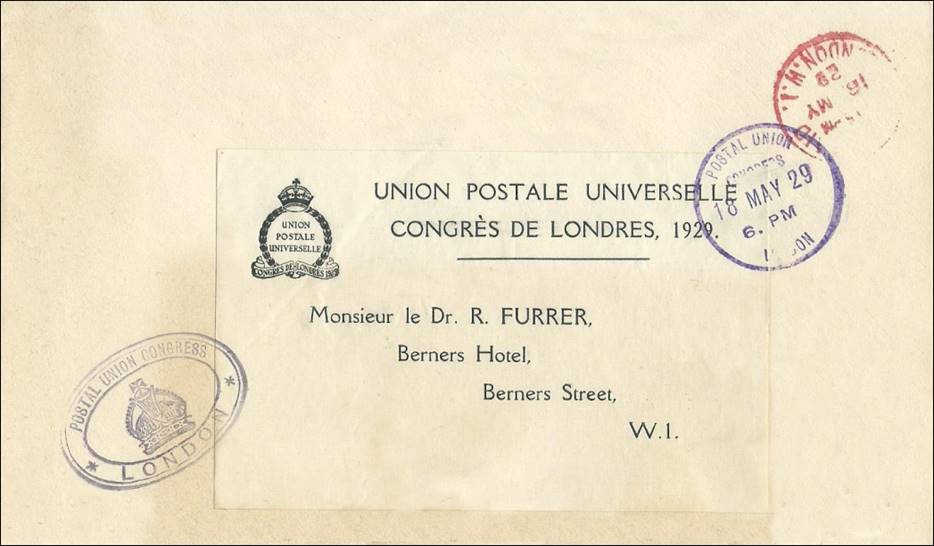 Official Delegate mailing label used at the 9th Universal Postal Congress held in London in 1929. The label printed with the delegate’s name (Dr. R. Furrer was from Switzerland) and hotel address is 108x70 mm. There is no franking. Violet cancel linked to the Post Union Congress. Violet congress cachet with the British Crown. Red London W1 postmark.