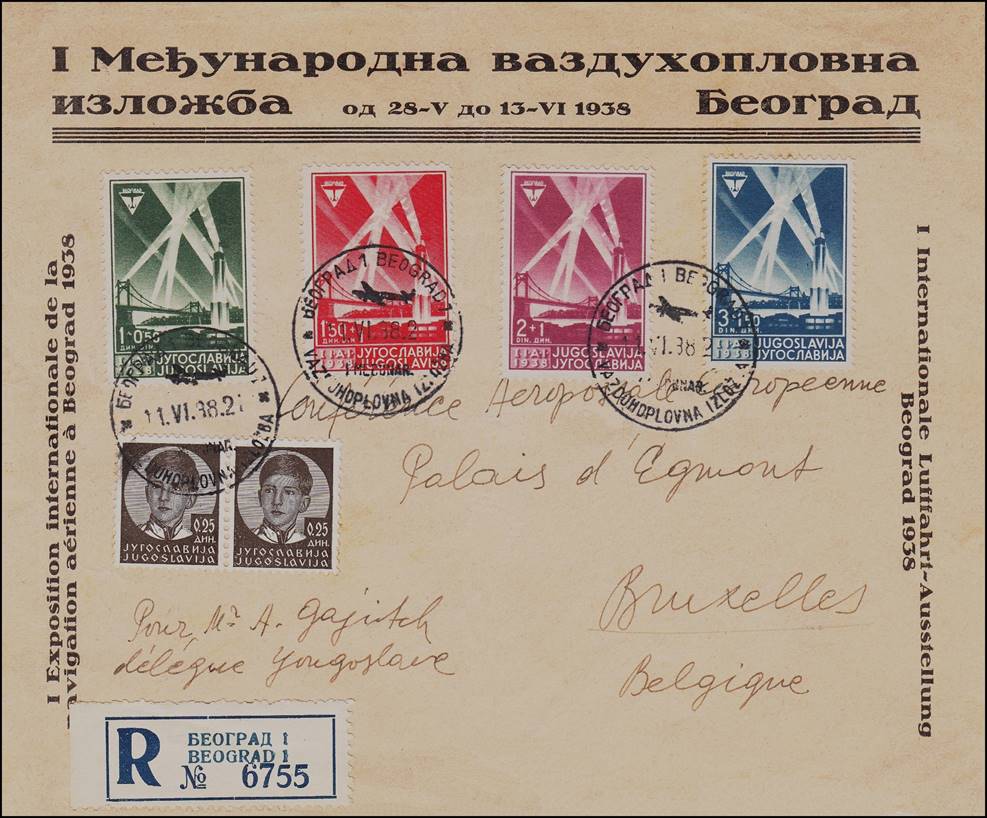First International Aviation Exhibition held in Belgrade, Yugoslavia from 28 May to 13 June 1938. Circular Date Stamp: 11 June 1938. Event cover sent to the Yugoslavian Delegate to the European Air Mail Conference held at the Egmont Palace in Brussels from 16 to 25 June 1938. The back of this cover shows the postmark of the conference dated 17 June 1938. The vertical text in French at the left-side reads as follows: Exposition internationale de la navigation aérienne, which in fact should have been (when translated from the German text): Exposition aérienne internationale.