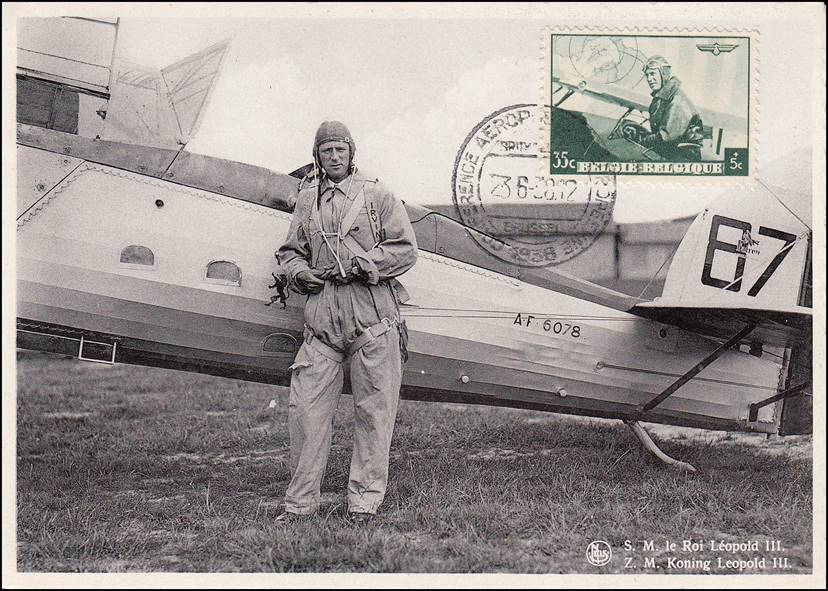 Belgium - Postcard (recto and verso) with a stamp issued on 23 March 1938 for the European Air Mail Conference (June 1938) on behalf of the National Commission on Aeronautical Propaganda, showing King Léopold III, Aviator, standing in front of the Fairey Fox AF-6078 aircraft. The Fairey Fox formed the backbone of the Belgian Air Force in the 30s and was even built under licence in Belgium.