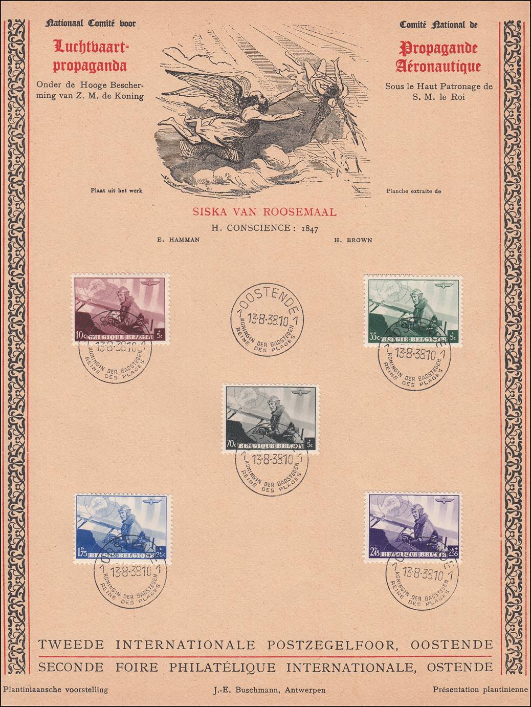Souvenir sheet issued by the National Commission on Aeronautical Propaganda on the occasion of the Second International Philatelic Fair held in Ostende, Belgium on 13 August 1938. The sheet shows the 5 stamps with King Léopold III, Aviator.