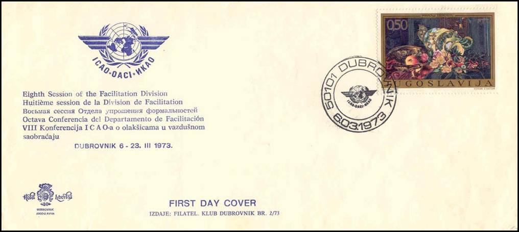 First day cover of the eighth Session of the Facilitation (FAL) Division, held from 6 to 23 March 1973 in Dubrovnik, Yugoslavia. |