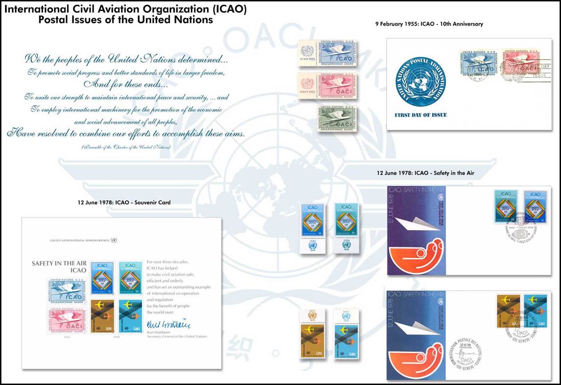 Framed poster presented to ICAO by Mr. Albert Pelsser, staff member at ICAO, upon his retirement. Montage with the Postal Issues of the United Nations for ICAO’s work, with Preamble to the UN Charter.