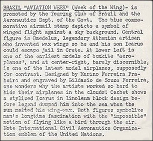 The commemorative airmail stamp is printed on paper with the watermark *BRASIL*CORREIO*; it depicts a symbol of winged flight against a sky background. The central figure is Deadalus, the legendary Athenian artisan who invented wax wings, so he and his son Icarus could escape jail in Crete. At the lower left of the stamp, is one of the earliest models of the box-kite aeroplanes and at the center-right, barely discernible, is one of the latest model airplanes, supposedly for contrast. Designed by Marino Ferreira Praheiro, one wonders why the artists worked so hard to hide the airplanes in the clouds. The cachet shows a stylized Icarus in linoleum block design before the legend dumped him into the sea when the sun melted his wing-wax. Both figures symbolize man’s long-time fascination with the impossible notion of flying like a bird through the air. Note ICAO’s emblem in the middle of the cover. Also note the error in the name of the Organization as written on the insert: ‘Aeronautics’ should have been more rightly written ‘Aviation’.