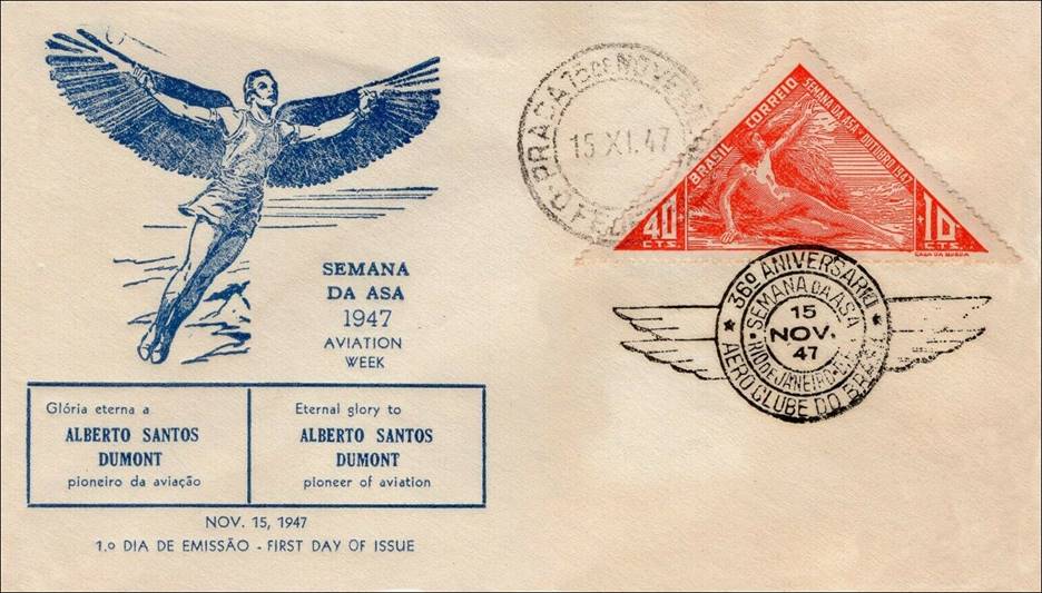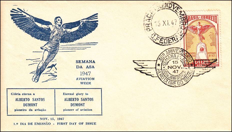Semana Da Asa – Released on 15 November 1947 for the 36th anniversary of the Semana Da Asa, the stamp shows the whole monument including its pedestal erected in St. Cloud. The year 1947 should have commemorated the 37th anniversary of the Semana Da Asa. The cachet shows Icarus escaping from jail.