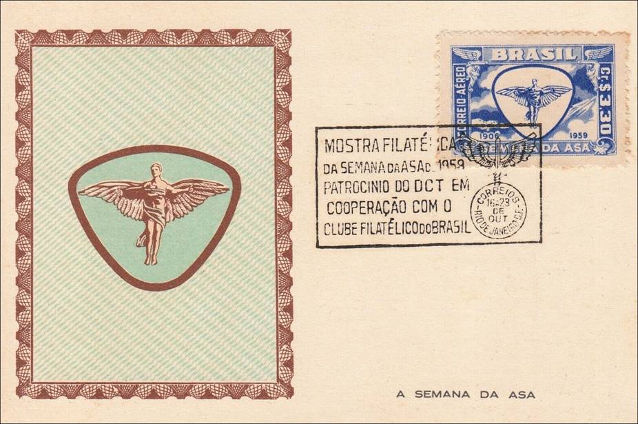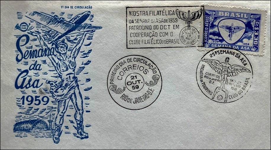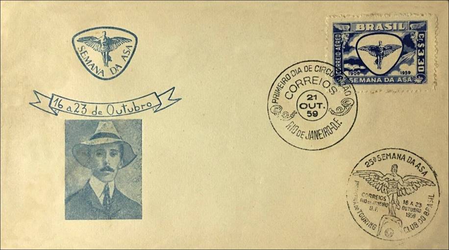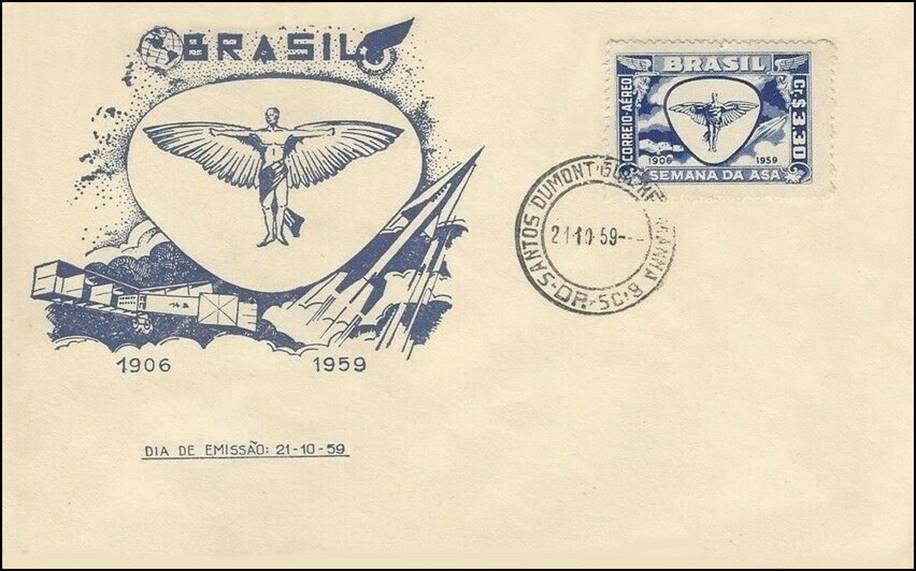 Semana Da Asa - First Day Cover dated 21 October 1959 At the left side, one can notice Santos Dumont’s Aeroplane 14bis (1906); on the right side, the design seems to represent the silhouette of a futurist aircraft.