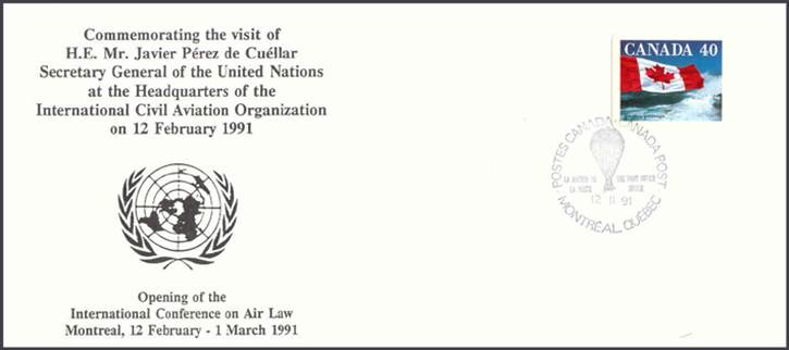 Visit of the UN Secretary General (Javier Pérez de Cuéllar) at ICAO Headquarters, Montréal, Canada on 12 February 1991, on the occasion of the International Conference on Air Law, which adopted the Convention on the Marking of Plastic Explosives for the Purpose of Detection. |