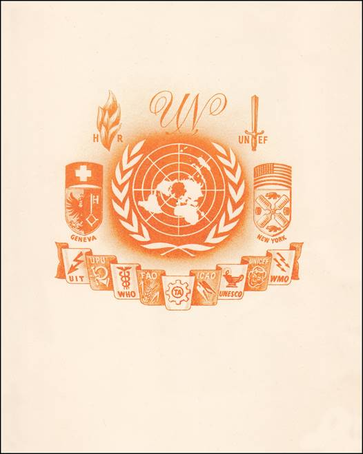 In 1958/1959, a group of countries shared a common design (i.e., omnibus or joint issue) to commemorate special events related to the United Nations. The planning and agreement between the postal administrations are what it identifies this as a joint issue. The circumstances of the issues varied, e.g., the United Nations Day (24 October), or the opening of UNESCO Headquarters in Paris (3 November 1958), or Tribute to the Technical Assistance, or the Universal Declaration of Human Rights (10 December 1948). In addition to the scroll with the names of 9 Agencies (including ICAO), the design shows Geneva’s and New York coats of arms (See footnotes 1 and 2) surmounted by the flags of the respective countries Switzerland and New York, respectively on the left and right sides of the UN emblem, thus indicating the main location of two UN sites at that time. At the top, one can see the initials of HR for Human Rights and UNEF for the United Nations Emergency Force.