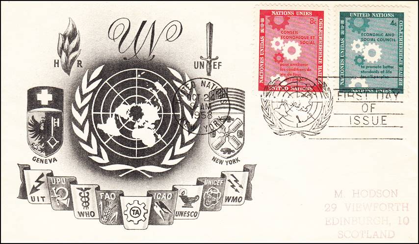 UNITED NATIONS UN Day 24 October 1958 The 2 stamps were issued to commemorate the work of the UN Economic and Social Council (ECOSOC). As one of the six main organs of the United Nations established by the UN Charter in 1946, ECOSOC is the principal body for coordination, policy review, policy dialogue and recommendations on economic, social and environmental issues, as well as for the implementation of the internationally agreed development goals. |