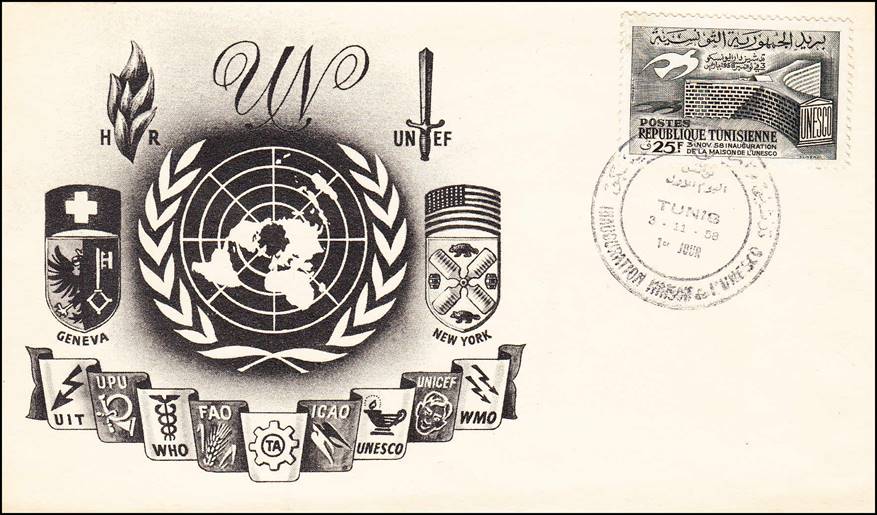 TUNISIA First Day Cover issued on 3 November 1958. Opening of UNESCO Headquarters in Paris. |