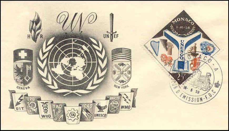 MONACO First Day Cover issued on 16 May 1959. Opening of UNESCO Headquarters in Paris. The stamp shows the UNESCO building and cultural emblems; the inauguration date of the UNESCO (3–XI-58) Headquarters is printed on the stamp. |