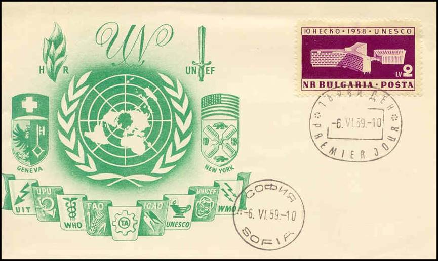 BULGARIA First Day Cover issued on 6 June 1959. Opening of UNESCO Headquarters in Paris. Note that the stamp was issued on 28 March 1959.
